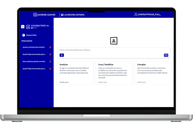 CONTRATTIPIÙ-IA è la soluzione per professionisti e aziende per agevolare la complessa attività di analisi, stesura e aggiornamento dei contratti, sviluppata con l’uso dell’Intelligenza Artificiale sulla base documentale Lefebvre Giuffrè.