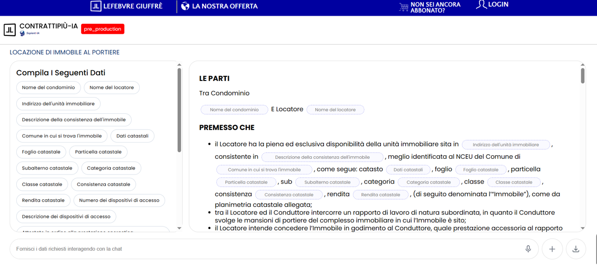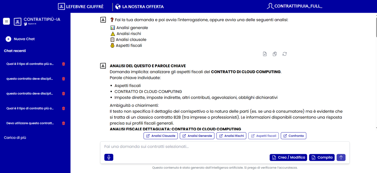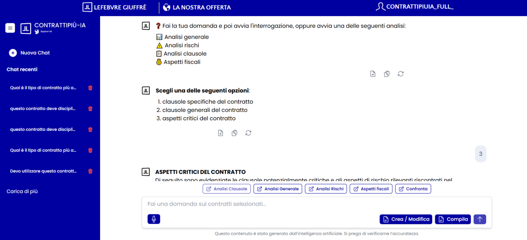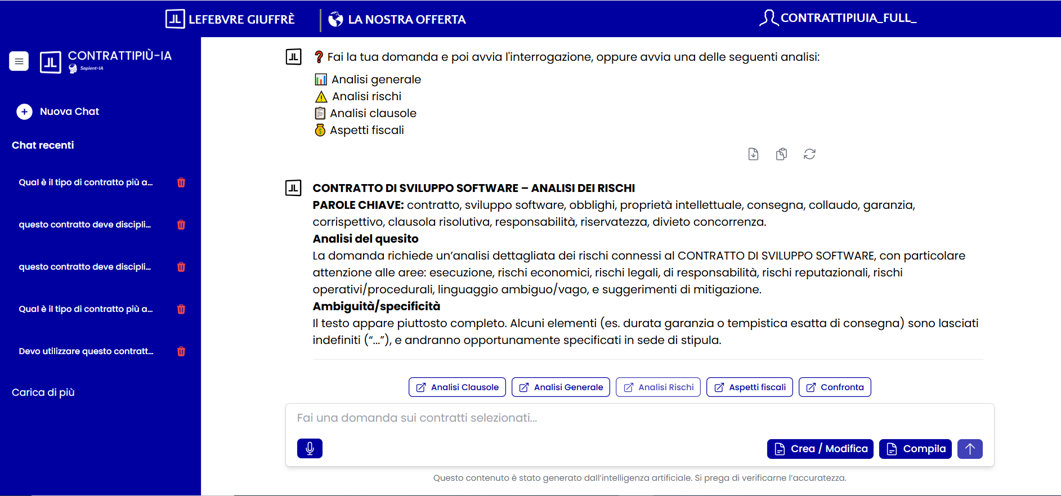CONTRATTIPIÙ-IA è la soluzione per professionisti e aziende per agevolare la complessa attività di analisi, stesura e aggiornamento dei contratti, sviluppata con l’uso dell’Intelligenza Artificiale sulla base documentale Lefebvre Giuffrè.